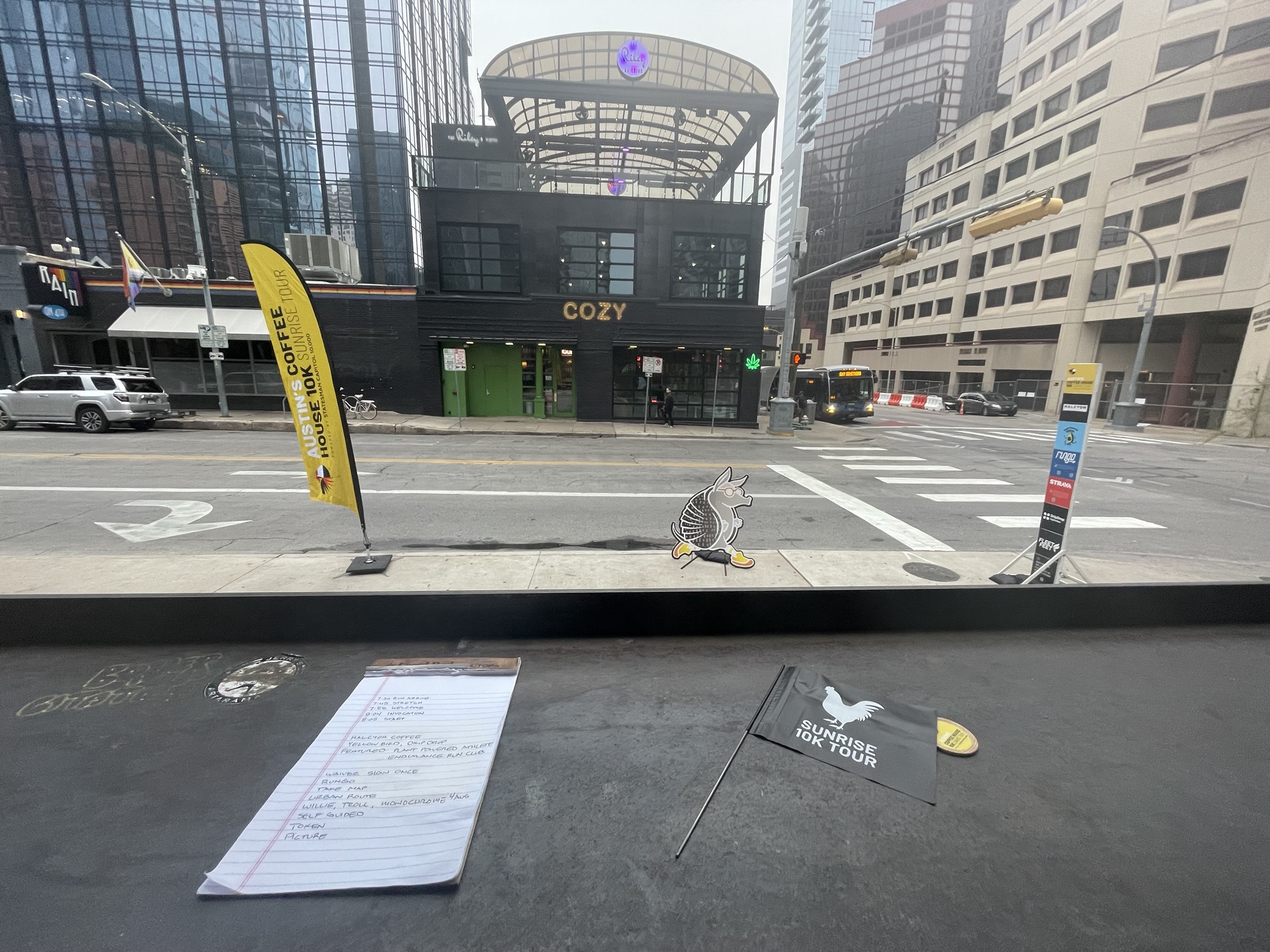 As I said, I didn’t run this week, but I’m glad I went to check it out. There was no post-run yoga this Saturday, but we did get free travel-size bottles of Yellow Bird, which is apparently going to be a staple at all the runs. New this year is the wooden token, pictured, which runners can exchange for a free coffee after the run (formerly this system required a runner’s bib to be reused every week). I’m also considering ordering a shirt this year; the new one is yellow.