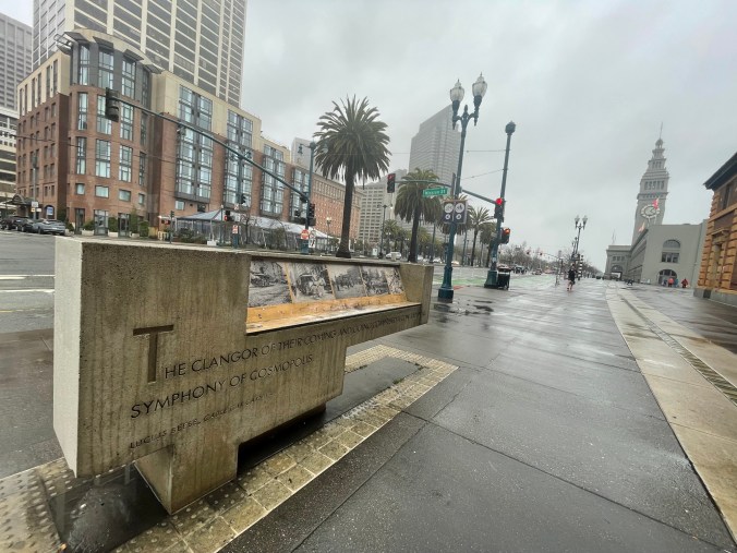 The airport tram runs to a Bay Area Rapid Transport (BART) station, where I purchased a Clipper card from a kiosk. I was headed to the Embarcadero on the advice of my sister, partially because I had been there before and knew the lay of the land. Kimble writes about the Embarcadero in City Limits, as an example of what a city can accomplish when citizens unite against a proposed highway which, in San Francisco’s case, would have run along that eastern waterfront.