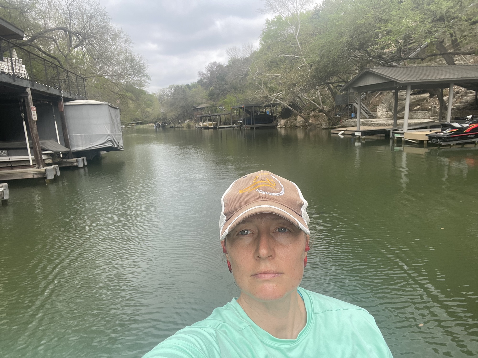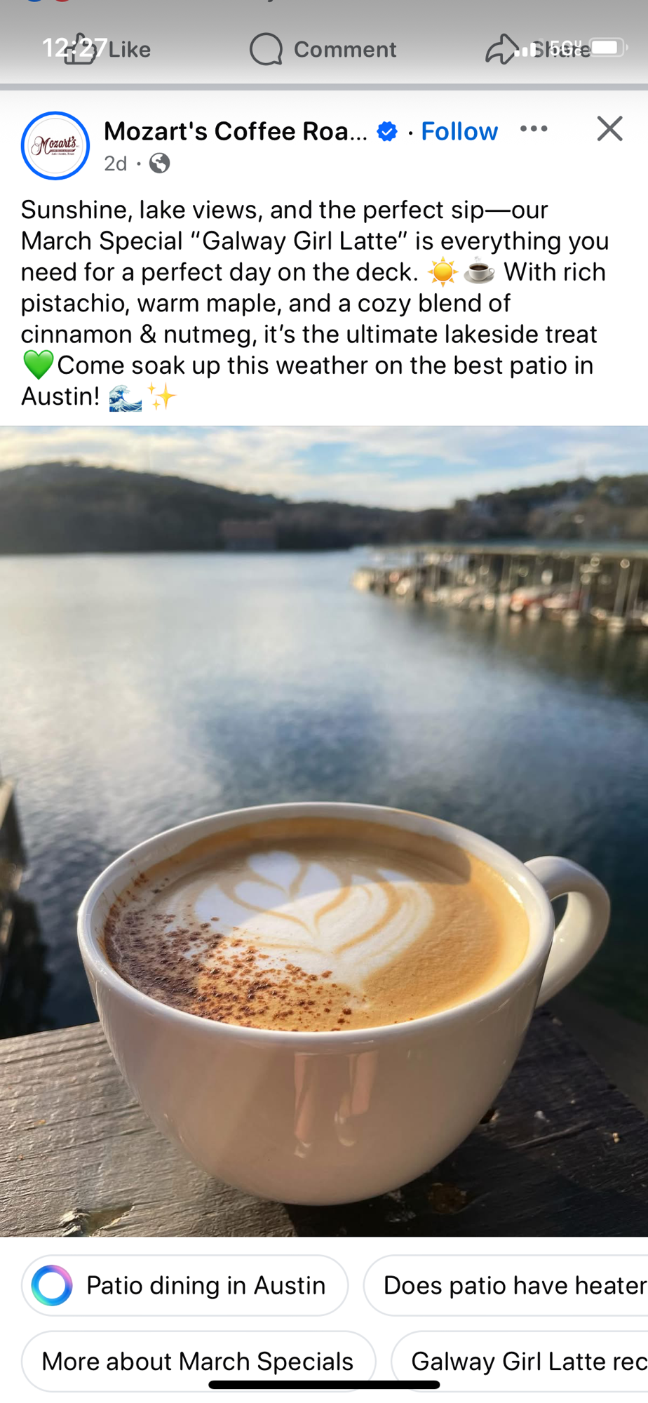 Saturday was the Mozart’s Lake Effect Glow 10k for the Sunrise Series. Since this was only the second time I have run all year, I allowed myself to stop and walk at 5k, so I got to stroll through Tarrytown at a leisurely pace and gawp at the houses. Of course it was not worth waiting in line for coffee, so I drove home in a weirdly misguided direction and stayed in my hood for the rest of the day. However, I saw on Instagram that Mozart’s was offering a Galway Girl Latte as a March special, and with the Mundy gig tonight, it seemed appropriate to head back. And since I was going to be there anyway, and Lake Austin Calm has opened for the season…