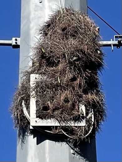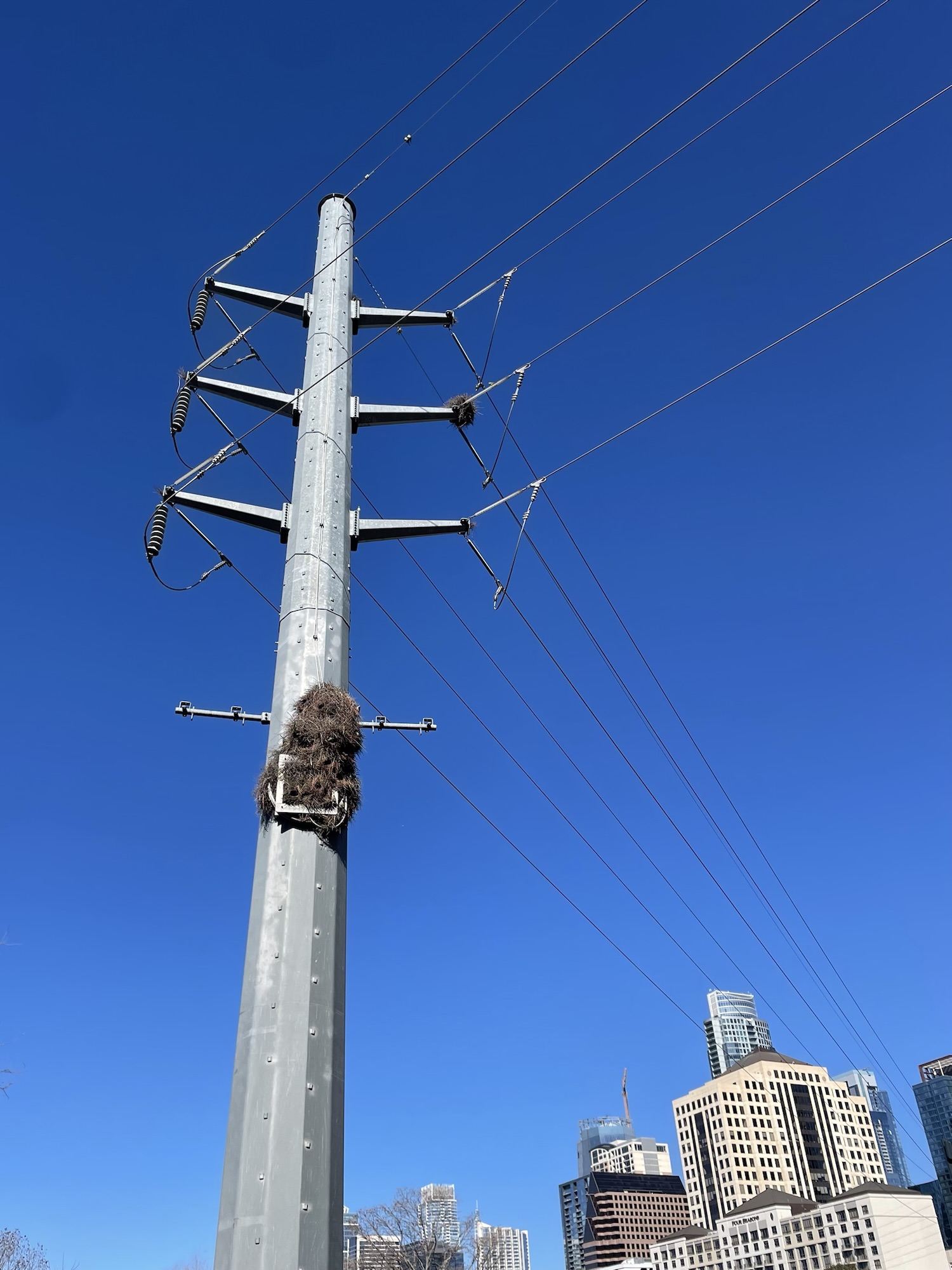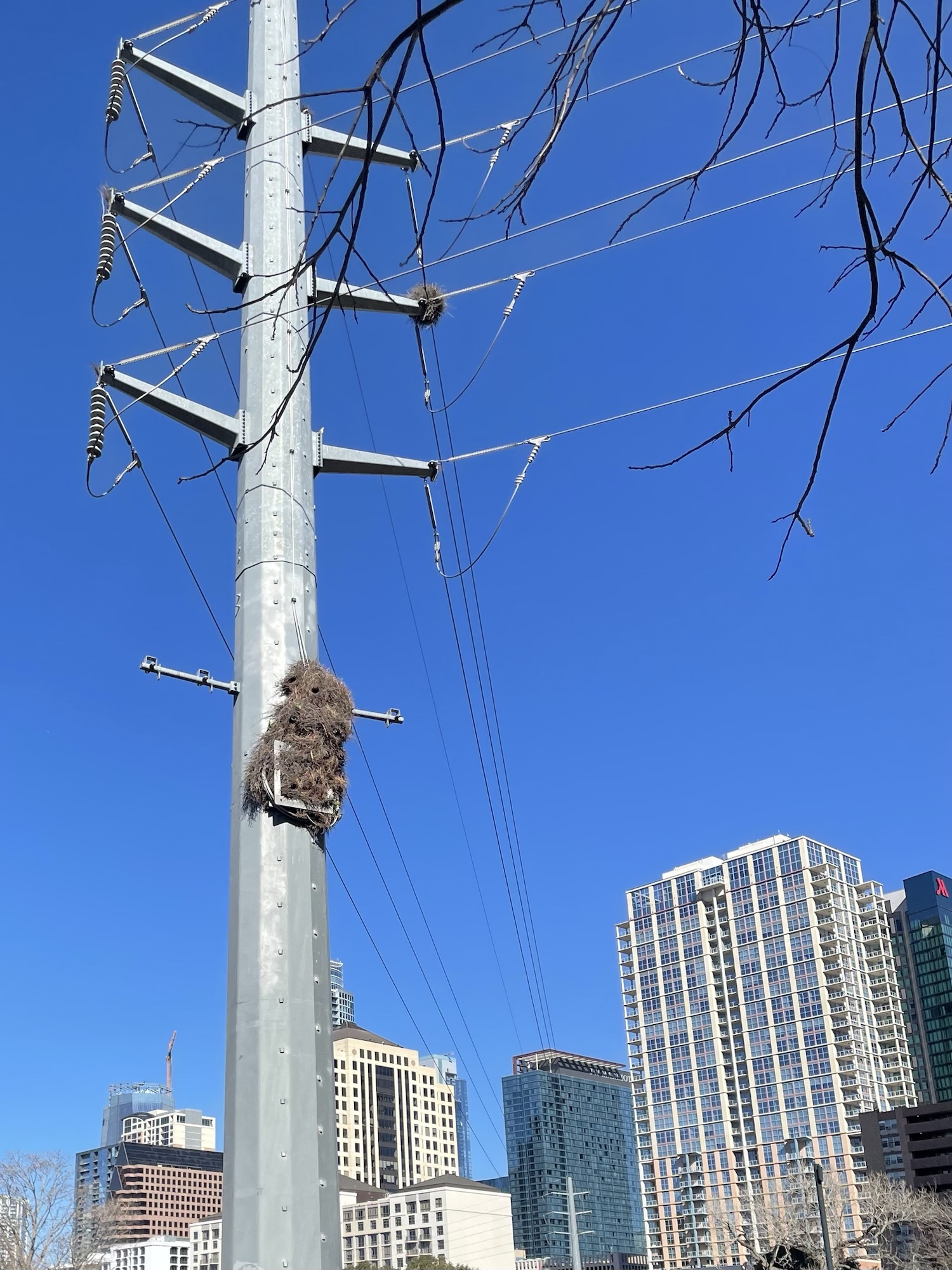 There’s a flock that feasts in the parking lot of a bookstore I used to work at on North Lamar (one my kinder former co-workers feeds them). I can’t remember the lore, if they are descended from escaped pets or just a little too far north of their natural habitat, but someone once pointed out to me that they build nests throughout the city, following along the power lines (maybe for warmth?). Anyway, they were super active today! Busy building the nest and chirping the whole time. My grinning photoshoot prompted a few other people to look up, sparking joy, and I’m sorry the green isn’t very vivid in the photos, but IYKYK–they are remarkable. I just know the Hartman Bridge/Waterloo Greenway Phase 2 trail was routed to showcase their cute little communal home on Lady Bird Lake.