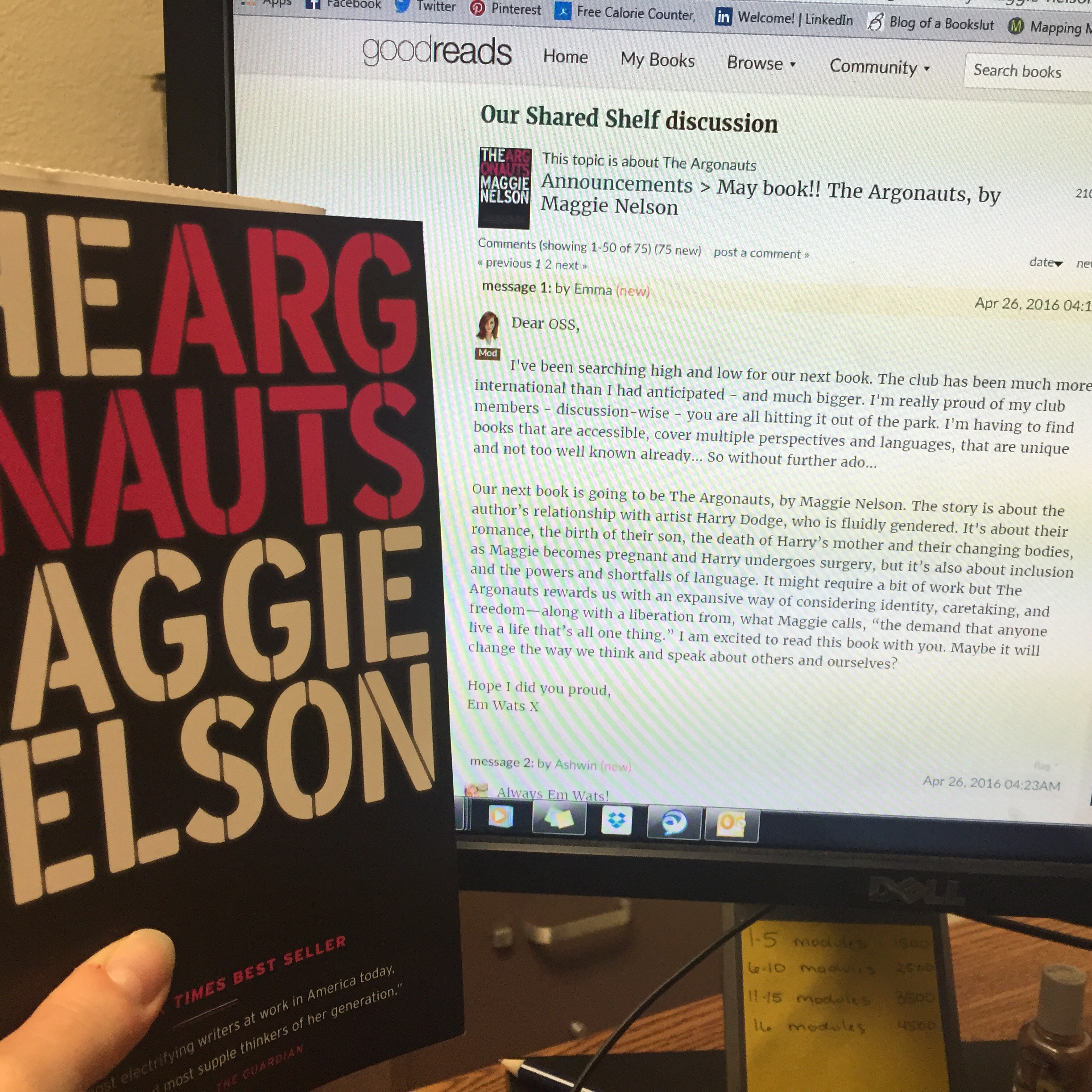 Funnily enough, later that night I saw a post about Emma Watson’s book club, Our Shared Shelf, selecting The Argonauts as their May book. I was hesitant to get caught up in Hermione’s book club when it started because I’m a bit fatigued with the Harry Potter franchise, and I admit that there was a moment, around the time of the Burberry ads and the theatrical release of The Perks of Being a Wallflower, when I was all, “Stop trying to make Emma Watson happen.” But she has turned into the best kind of feminist starlet, and her book club is better than my book club, so I just joined the group on Goodreads.